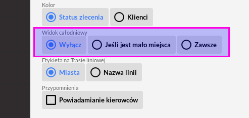 3) Opcja „Zawsze” która jest przeciwstawna do opcji pierwszej, czyli trasy zawsze będą wyświetlane na całą szerokość dnia, jeśli będzie ich więcej niż jedna zostaną zgrupowane. Ta opcja jest wygodna dla krótkich tras jak dowozy pracowników lub transfery lotniskowe: