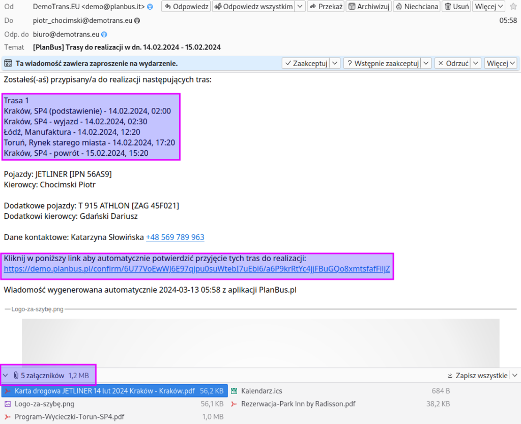 Kierowca otrzymuje wykaz zaplanowanych tras, których przyjęcie do realizacji potwierdza jednym kliknięciem w link znajdujący się w e-mailu