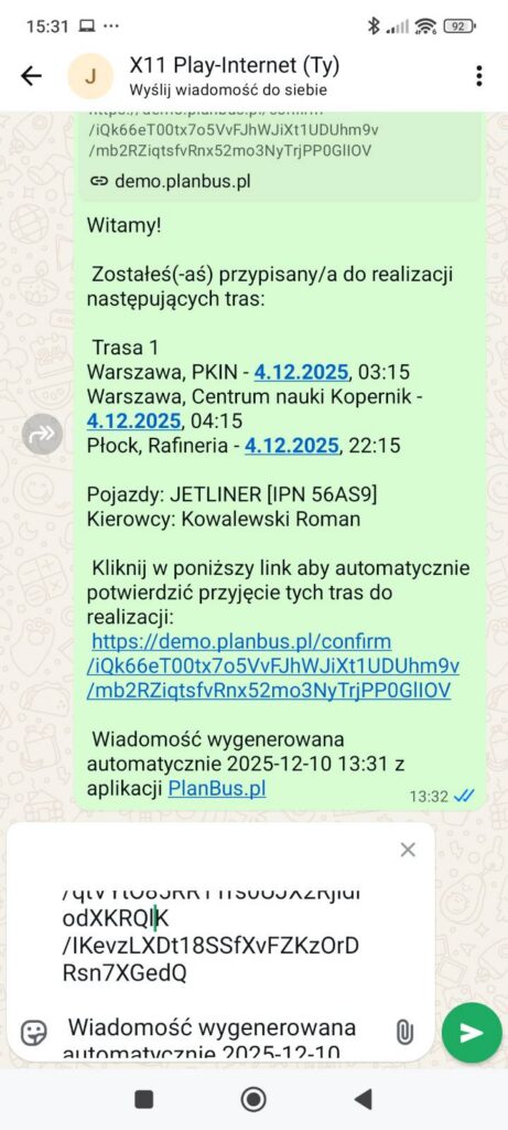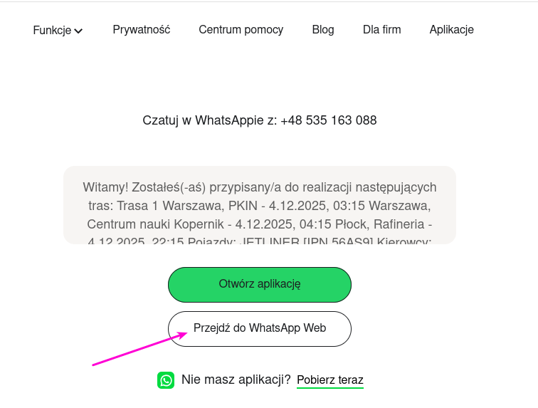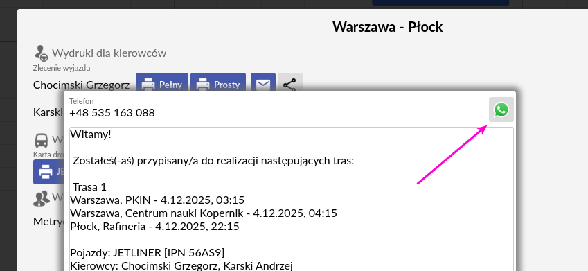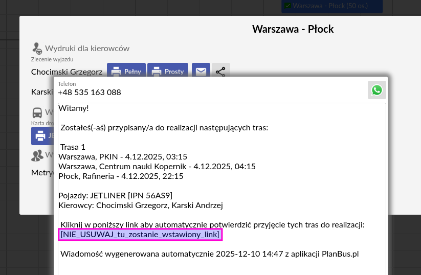 UWAGA Z uwagi na to, że funkcja udostępnianie wykorzystuje serwery globalne WhatsApp, bardzo wskazane jest wpisanie numerów telefonów do kierowców w formacie międzynarodowym, czyli z naszym +48 na początku.