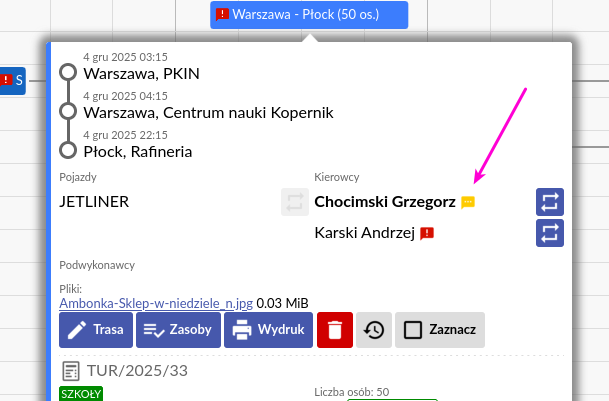 Po kliknięciu wiadomość staną się dwie rzeczy. Pierwszą z nich jest zmiana statusu powiadomienia kierowcy na wysłane, co jest sygnalizowane żółtą ikoną na dymku trasy: