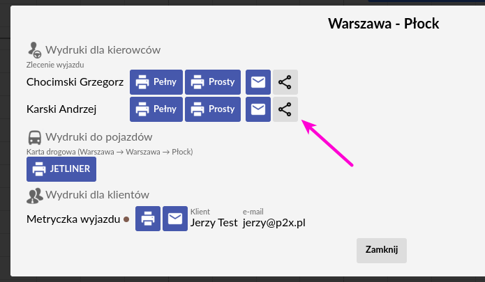 Na formularzu wydruków w kalendarzu lub na liście zleceń, pojawiła się nowa ikona „Udostępnij”