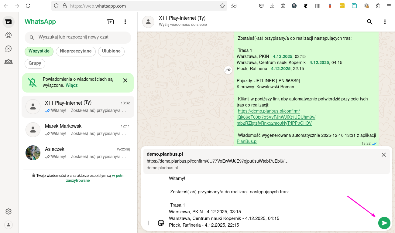 A drugą jest przekazanie wiadomości do aplikacji WhatsApp. Od tego miejsca opuszcza ona już naszego PlanBus’a i dalej jest już przetwarzana gdzie indziej. Dlatego, kliknięcie i przejście dalej możemy uznać za chwilę wysłania. Zakładamy bowiem, że dalej wszystko się powiedzie 🙂