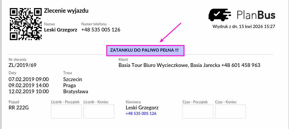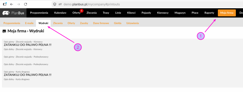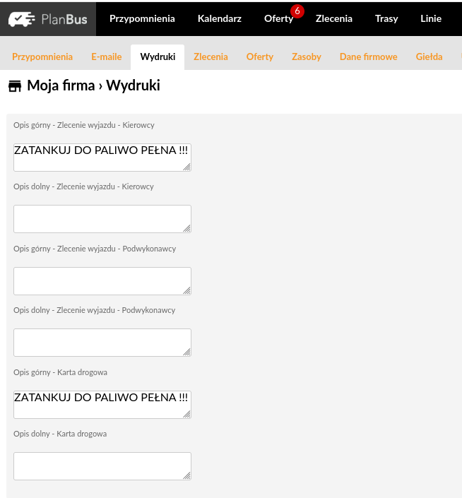 Dodaliśmy możliwość wstawienia do wydruków dla kierowców stałych informacji, poleceń dla kierowców. Takich, które są na przykład wymagane zawsze ale kierowcy o nich zapominają.